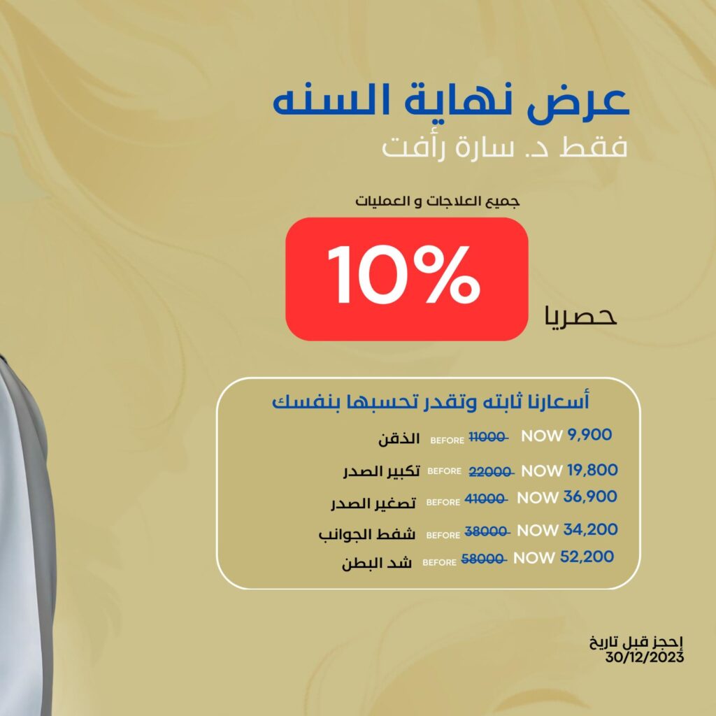 - الأسعار المذكورة لا تشمل القيمة المضافة، الألبسة، التحاليل الدموية، أو الأدوية. سيتم إضافة القيمة المضافة المعتمدة وفقًا للتشريعات.